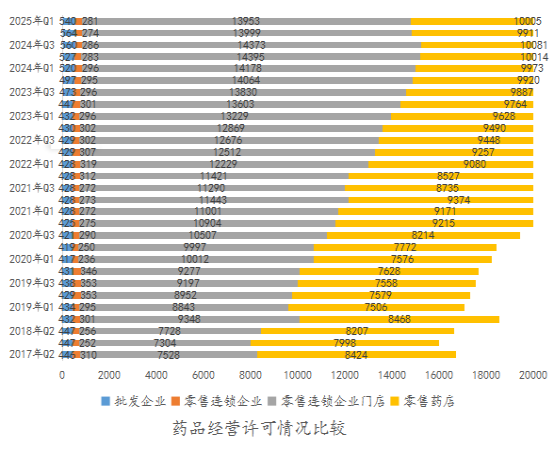 截至2025年3月底,全省共有药品经营许可证持证企业24798家,其中:批发企业540家、非法人批发19家、零售连锁总部企业281家、零售连锁企业门店13953家、零售药店10005家。
